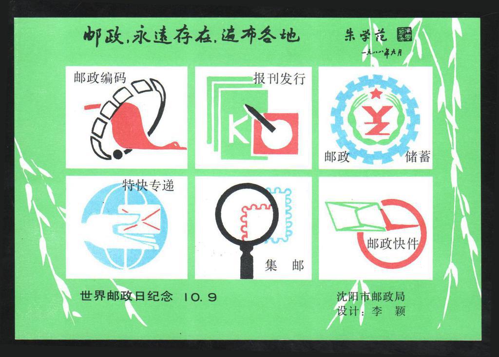 | Description | In Comm of the International Postal Service Day, October 9. Text at top: Postal Service Will Allways Exist and Cover the Whole World. Mr. Zhu Xuefan, 1988-6. | |