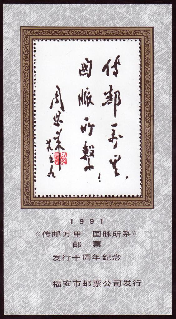 | Description | In Comm of the 10th Anniversary of the 'To Deliver Mail for Ten Thousand Li, has Bearing on Arteries and Veins of the Country'stamp. | |