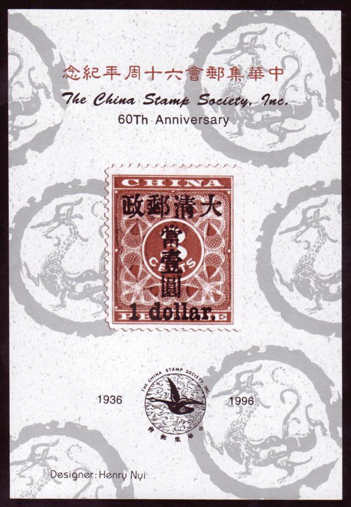 | Description | The China Stamp Society Inc. 60th Anniversary, 1936-1996. | |