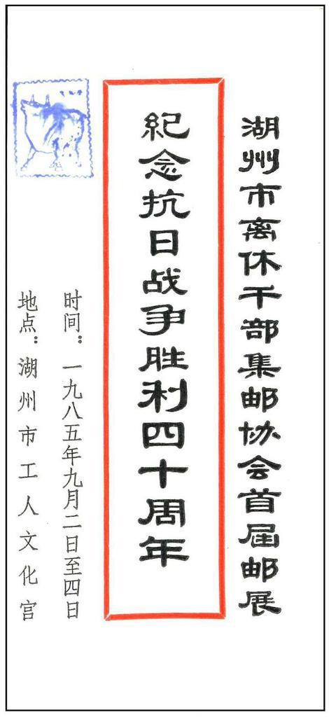 | Description | The 1st Stamp Exhibition of the Philatelic Association of Retired Cadres in Huzhou Commemorating the 40th Anniversary of the Victory in the War of Resistance Against the Japanese Took Place: Huzhou City Workers Cultural Palace. | |